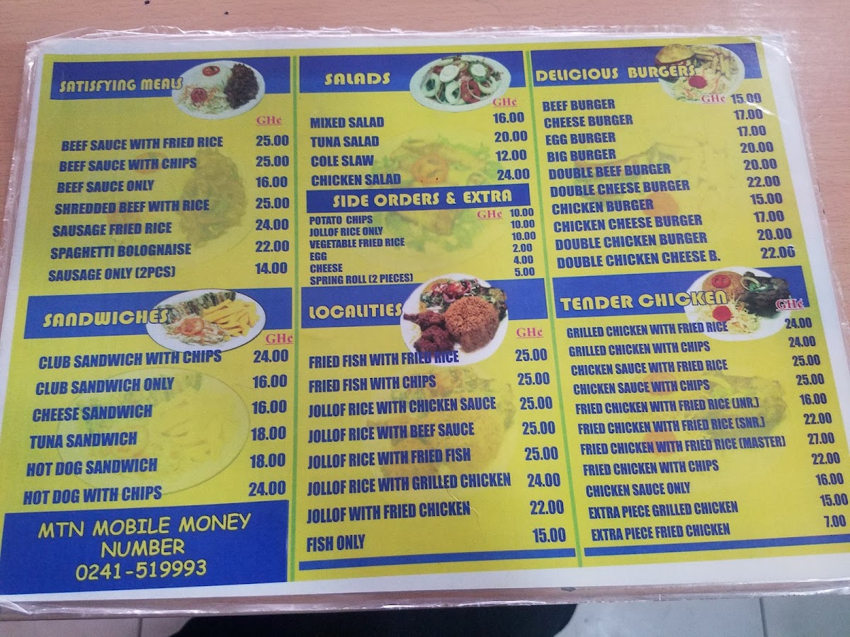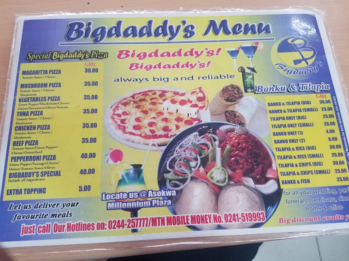 The menu at Bigdaddy's Restaurant reflects a confident balance between hearty comfort food and familiar local favorites, with a clear focus on generous portions and crowd-pleasing flavors. Staples like Jollof Rice and Fried Rice anchor the menu as reliable, well-seasoned bases, often paired with protein choices such as Grilled Chicken, Fried Chicken, or Beef that emphasize smoky char or crisp textures. For diners seeking something more indulgent, items like Beef Burger, Chicken Burger, and Loaded Fries deliver classic fast-casual satisfaction, combining rich sauces, melted cheese, and filling sides. The presence of Banku with Grilled Tilapia and Fufu with Light Soup adds cultural depth, showing respect for traditional Ghanaian tastes while remaining accessible to a broad audience. Lighter options such as Salads and simple sides help round out the menu, making it adaptable for both quick bites and full meals. Overall, the menu feels cohesive and practical rather than experimental, prioritizing flavor consistency and familiarity; it is designed to leave diners comfortably full, with clear choices that cater to families, groups, and anyone looking for dependable, well-executed dishes without unnecessary complexity.